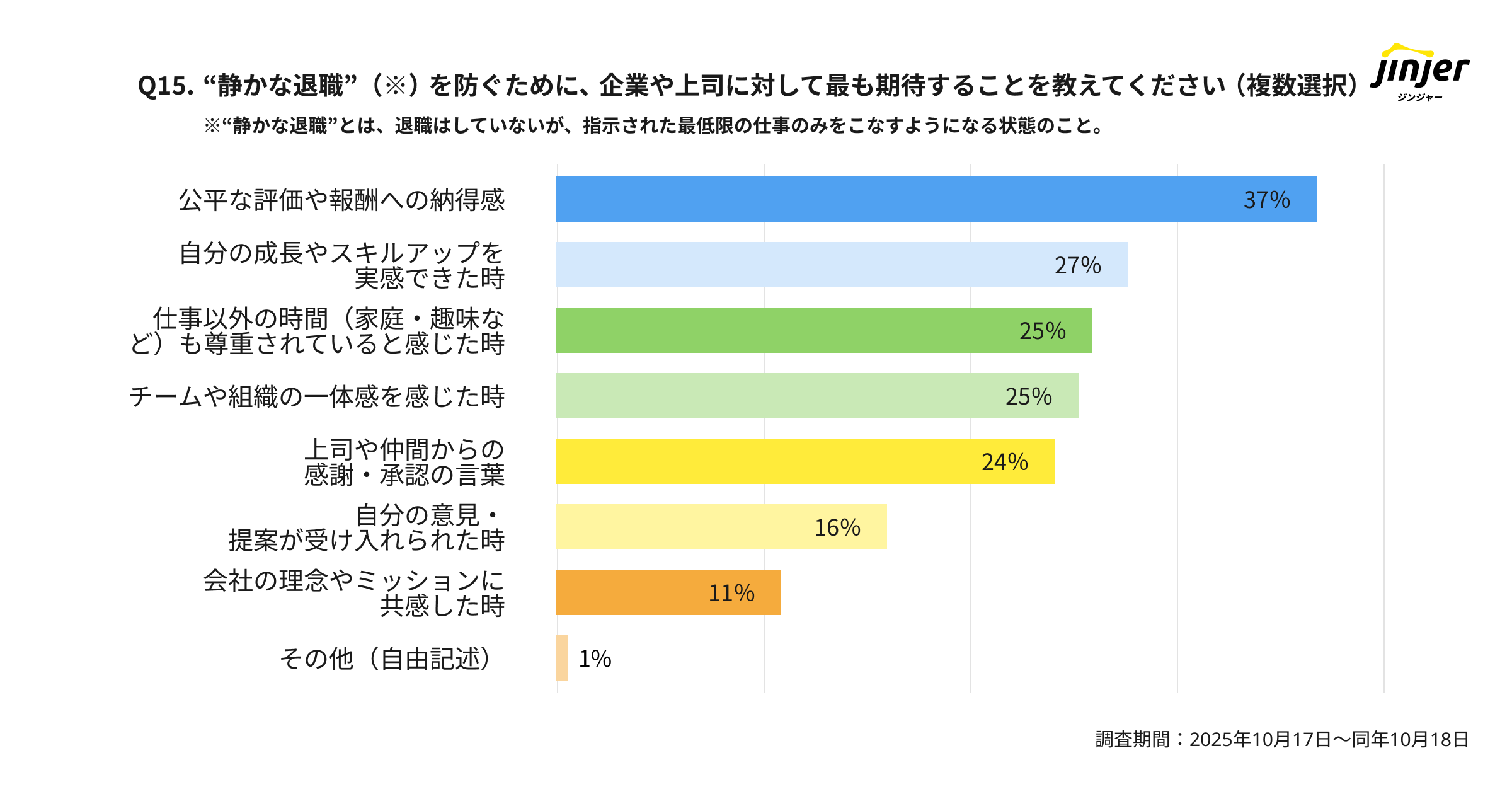 その中でも、「チームや組織の一体感」や「上司・仲間からの承認」も重要視されていますが、それ以上に「正当な対価や納得感(37%)」と「自身の成長やスキルアップ(27%)」という、より実利的な要素が「静かな退職」を食い止めるポイントとなり得ることが伺えます。