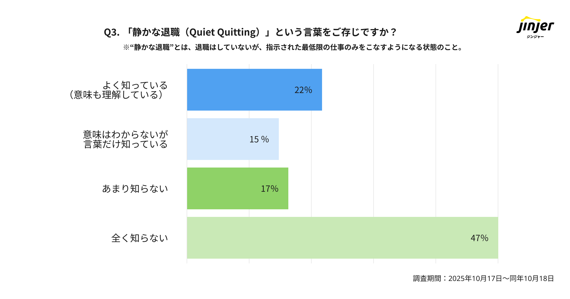 とくに「全く知らない」と答えた層が47%を占めていることから、言葉の定義(退職はしないが、指示された最低限の仕事のみをこなす状態)を含めた社会的な浸透はまだ限定的であると言えます。