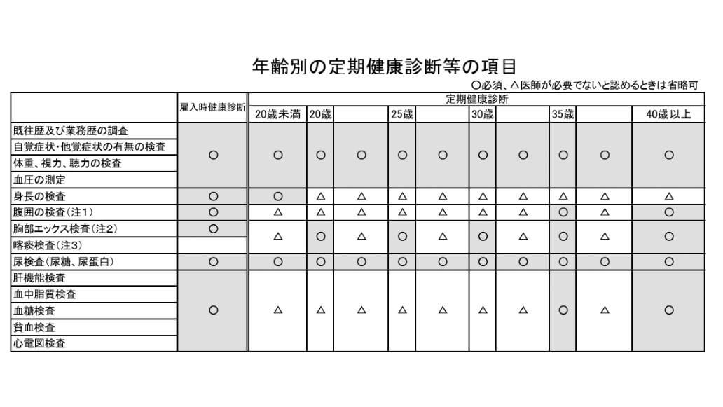 定期健康診断の診断項目は、年齢によって必須のものと、医師が必要でないと認めるときは省略可のものがあります。