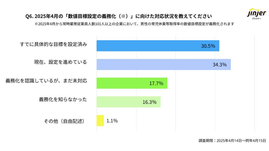 2025年4月にjinjerが実施したアンケート調査では、すでに30.5%の企業が数値目標の設定に対応済みで、現在目標の設定に向けて進めている企業が34.4%との結果でした。同時に、「義務化を知らなかった」と回答した企業も16.3%ありました。