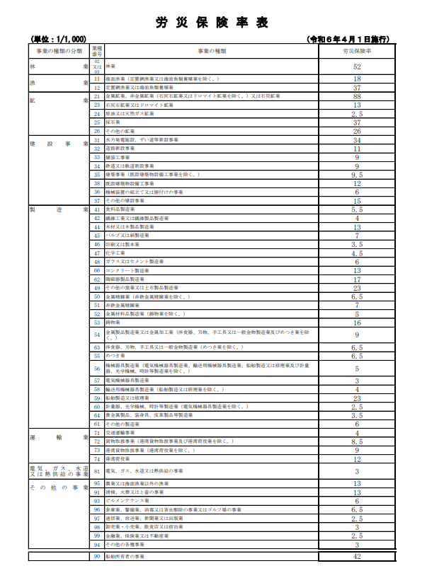 令和7年度(2025年度)の労災保険率は、令和6年度(2024年度)と同様で、次の表の通りです。