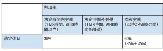 | 法定時間外労働(1日8時間、週40時間を超過) | 35% |