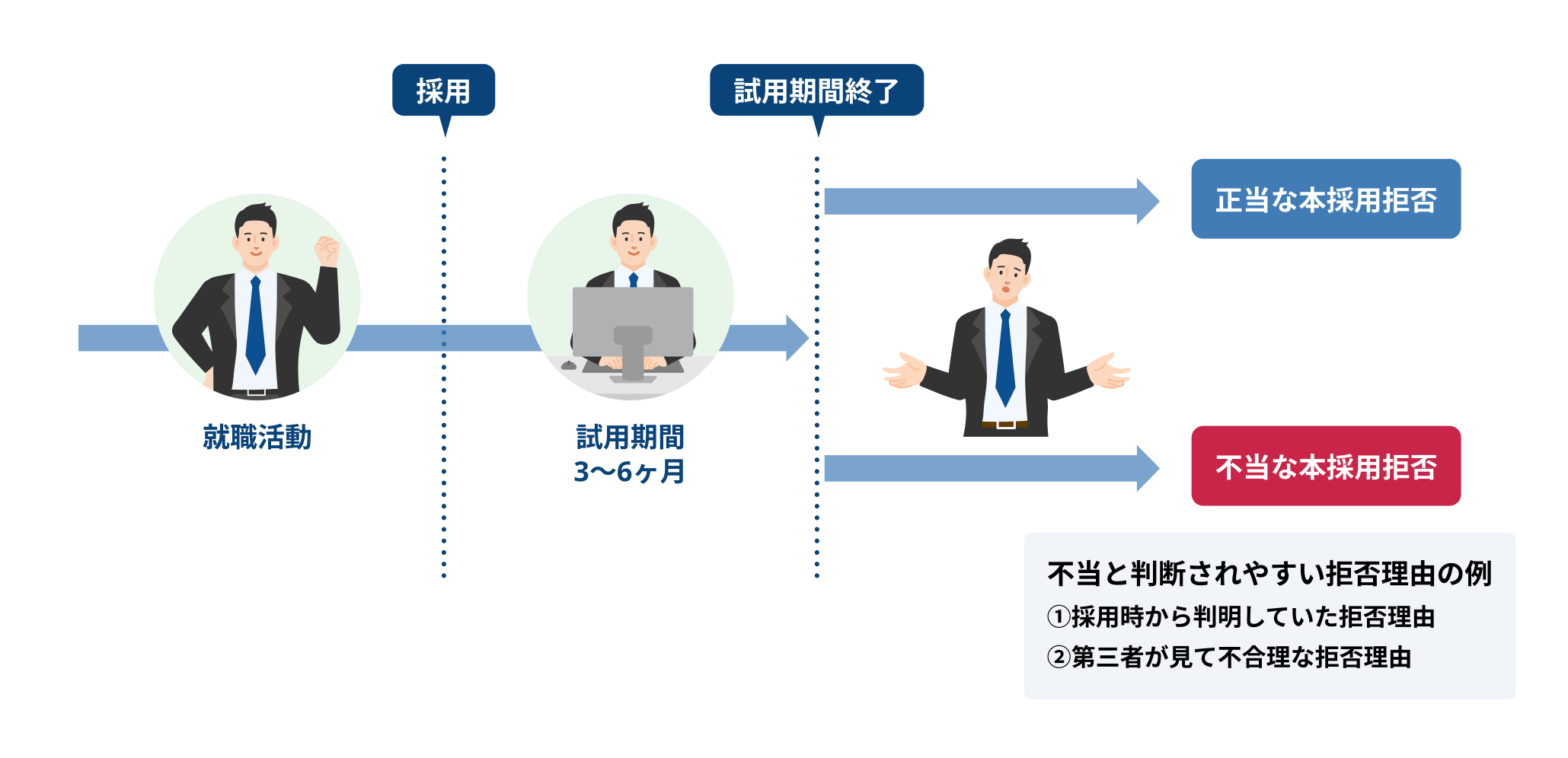「仕事の成果を出していない」「効率が悪くミスが多い」などの理由だけで本採用を拒否した場合は、不当解雇と判断される可能性が高いため注意しましょう。