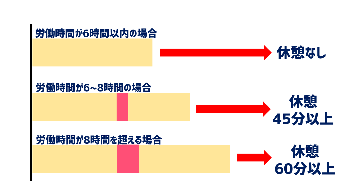 - 1日の労働時間が8時間を超える場合は、少なくとも1時間の休憩が必要