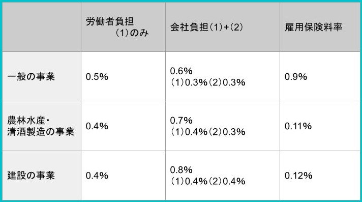 | 労働者負担(1)のみ | 会社負担(1)+(2) | 雇用保険料率 | |