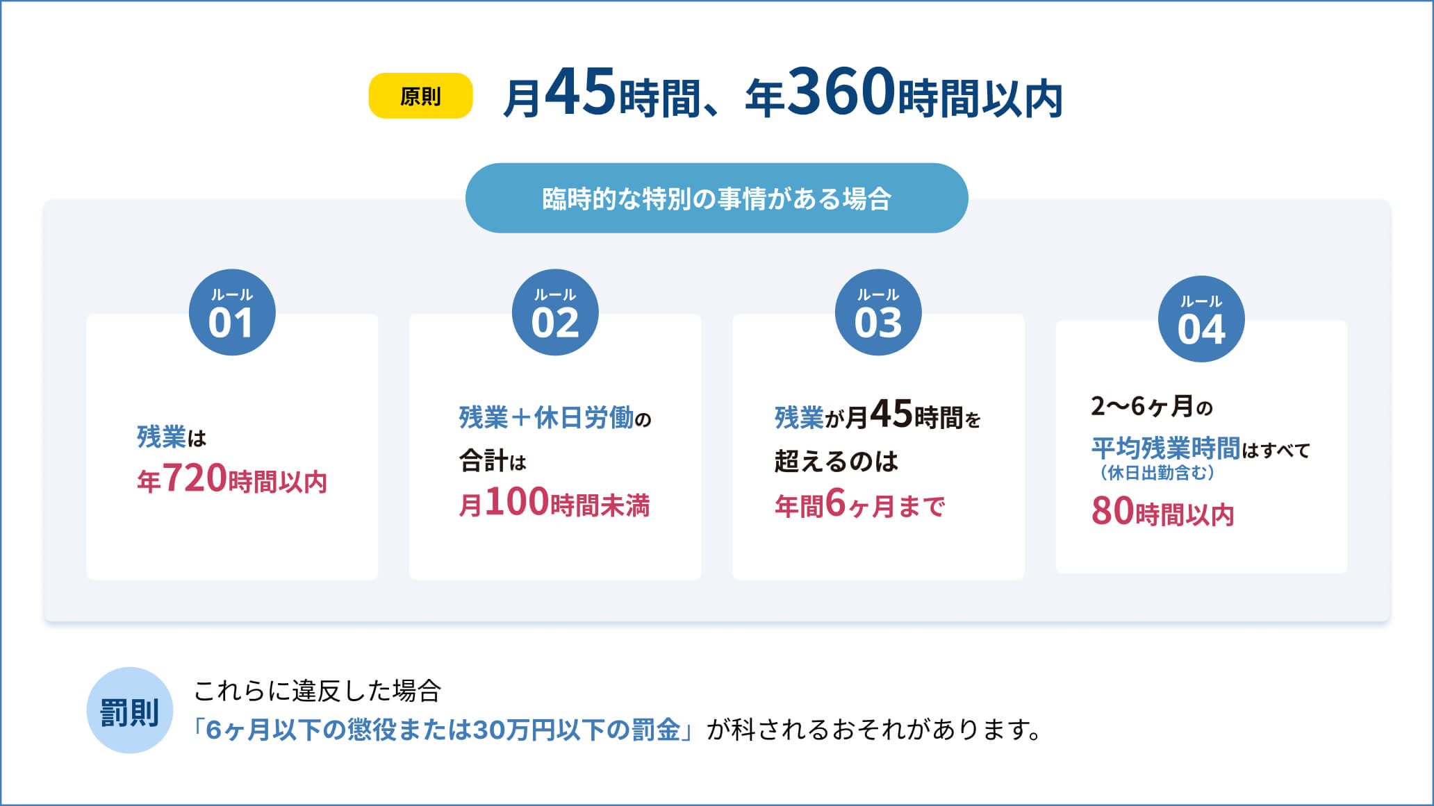 また、働き方改革によって、残業時間の上限規制を超過した時の罰則が新たに設けられました。以下の規制に違反した場合も、6ヶ月以下の罰金または30万円以下の罰金に処される可能性があります。