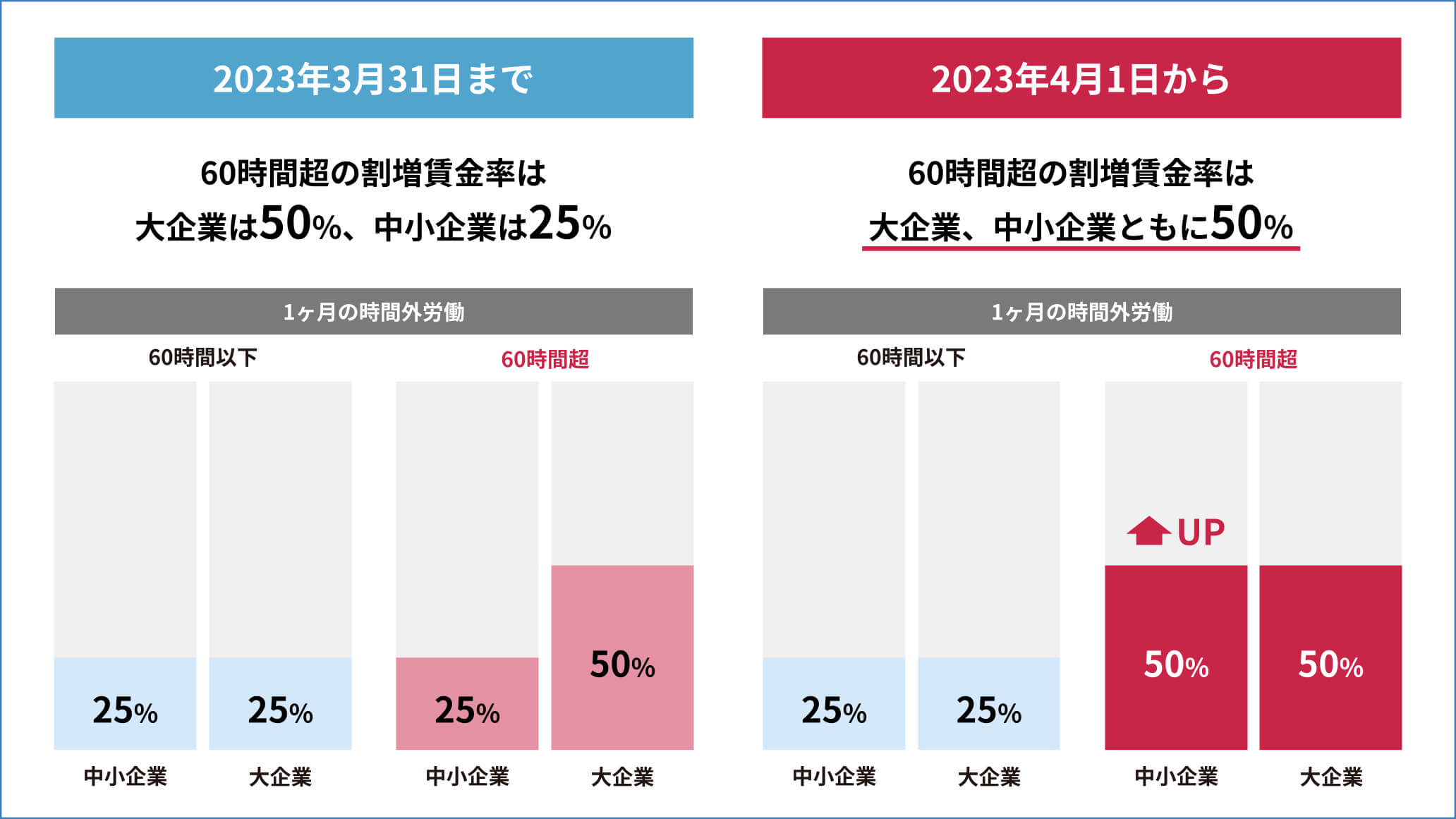 これまで、大企業には時間外労働時間が60時間を超えた場合、超過した時間分について割増率50%以上で賃金の支払い義務がありました。この規定についてこれまで中小企業は対象外でしたが、2023年4月より中小企業も対象となります。