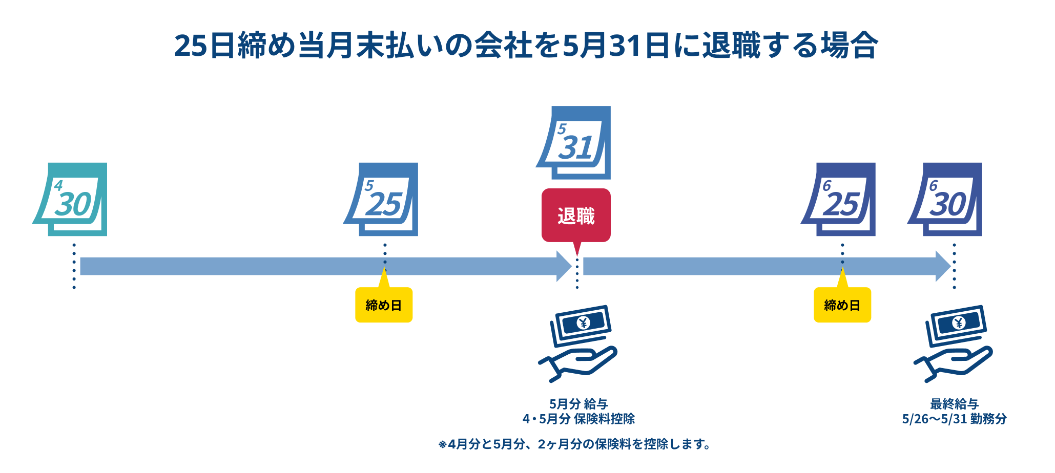 具体例を挙げると、退職日が5月31日なら、社会保険料の締日は6月1日となり、前月である5月分まで保険料が発生します。