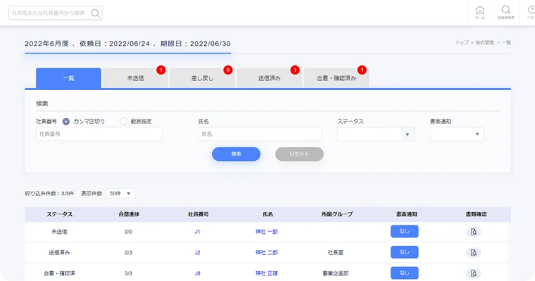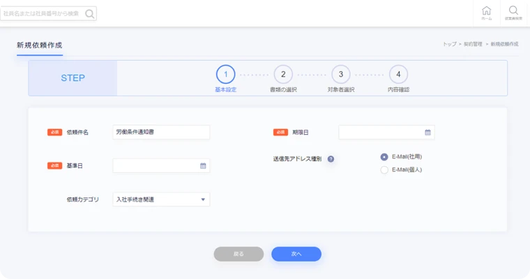 件名、期限日、書類セットなどを指定して、Web上から従業員に一括で依頼することができます。