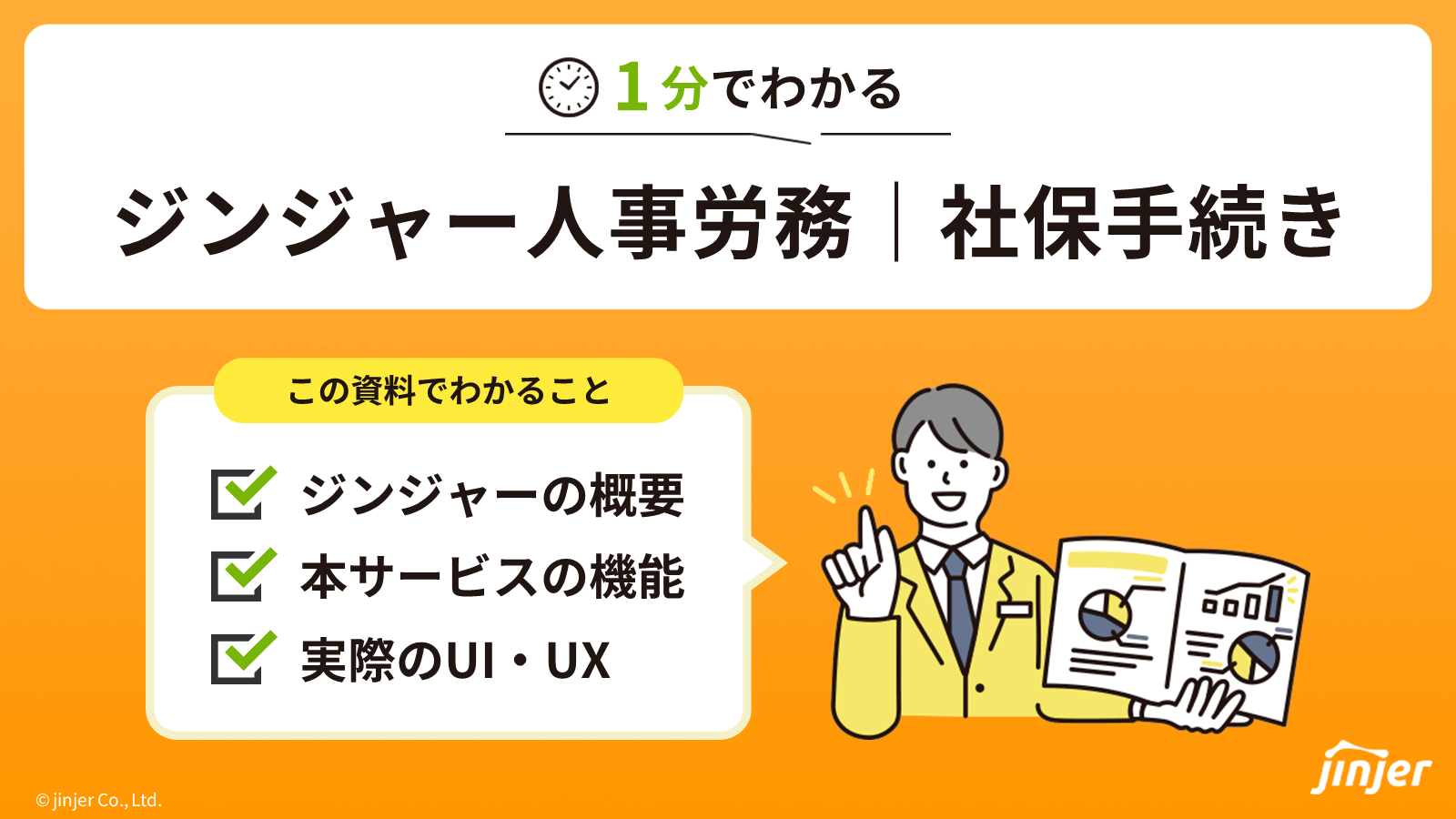 労務関連書類の作成や申請をオンライン化し、業務効率を改善できるジンジャー人事労務|社保手続き。本資料では、ジンジャー人事労務|社保手続きのメリット・機能・特徴を細部までご紹介。ぜひご覧ください。