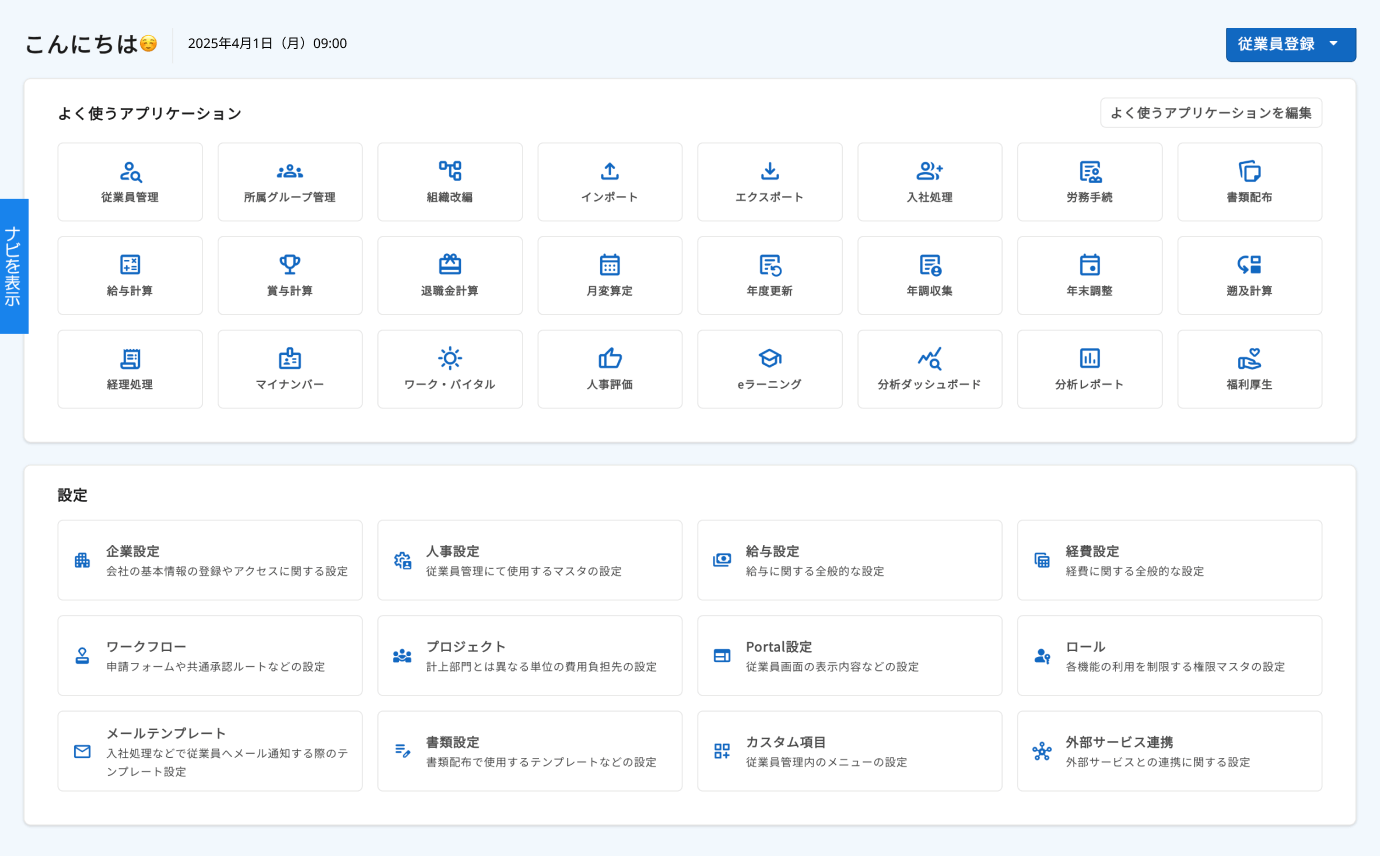 勤怠管理や給与計算、ワークフロー申請など、多岐にわたる機能に一度のログインでアクセス可能。
