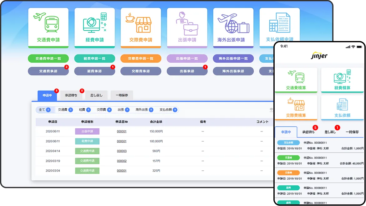 交通費申請、経費申請、交際費申請、出張申請、支払依頼申請がスマホやパソコンで可能です。