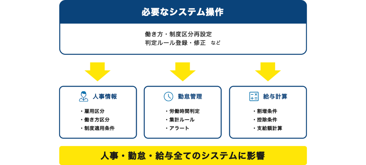 現在議論がされている改正案が施行されると、勤怠管理や給与計算、人事情報の管理などシステム対応が発生する可能性があります。