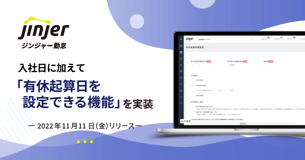 バックオフィス向けクラウドサービス「ジンジャー勤怠」を提供するjinjer株式会社(本社:東京都新宿区、代表取締役CEO:加藤 賢)は、入社日に加えて有休起算日を設定できる機能を2022年11月11日(金)から実装することをお知らせいたします。