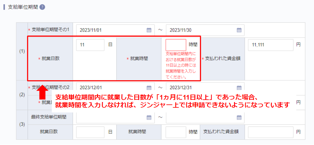 支給単位期間内に就業した日数が1ヵ月に11日以上であった場合には、「実際に就業した時間」を記載しなければいけない旨が注釈として出るようになっています。これにより、管理者側の入力ミスの削減につながります。