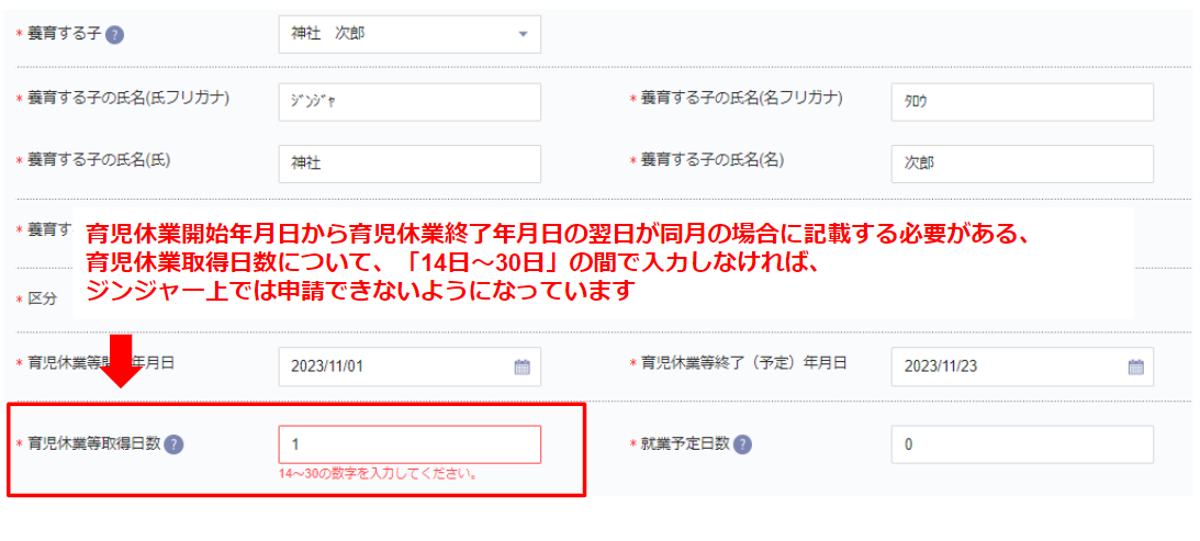 健康保険・厚生年金保険育児休業等取得者申出書については、育児休業開始年月日から育児休業終了年月日の翌日が同月の場合に記載する必要がある「育児休業取得日数」について、ジンジャー上で申請する際は、制度上で定められている「14日~30日」の間で入力しなければ、申請できないようになっています。これにより、管理者が細かい制度を理解した上でスムーズに電子申請を行うことができます。
