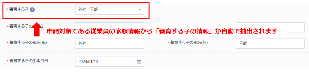「ジンジャー人事労務」の人事データに登録されている該当従業員の家族情報から、育児休業を取得する「養育する子の情報」を自動で抽出することで、細かな入力ミスが削減されることにつながります。