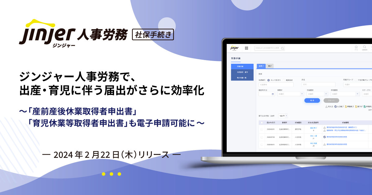 クラウド型人事労務向けシステム「ジンジャー」を提供しているjinjer株式会社(本社:東京都新宿区 代表取締役社長:桑内 孝志)は、人事労務システム「ジンジャー人事労務(社保手続きオプション)」で、出産・育児に伴う2種類の届書について、2024年2月22日(木)に新たに電子申請が可能になったことをお知らせします。