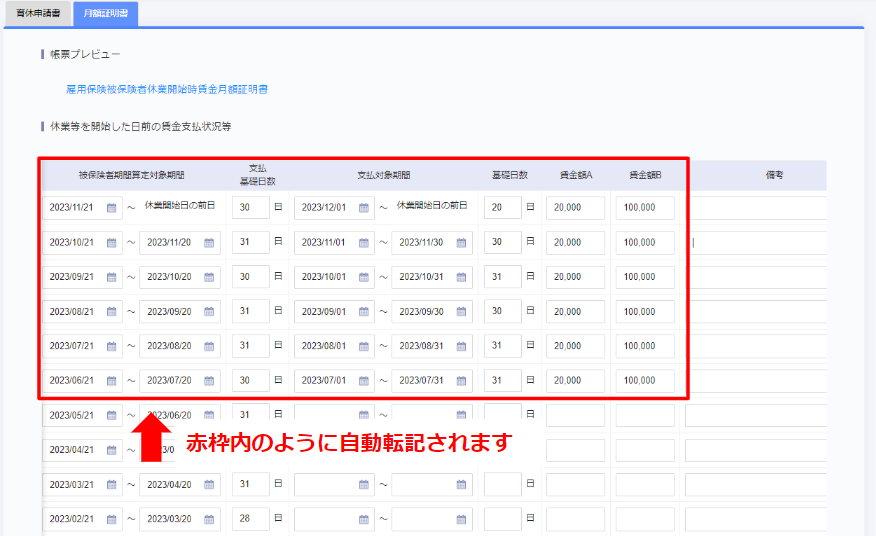 その際、「ジンジャー人事労務」上に登録されている人事データ(育児休業開始年月日)を基に、被保険者期間算定対象期間、支払基礎日数、支払対象期間、基礎日数を自動転記することができます。また、「ジンジャー給与」の給与データと連動させることで、ルールに従った形で賃金額A、賃金額Bを自動転記することも可能となります。