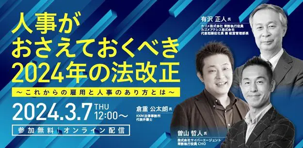 そのような背景を踏まえ、本カンファレンスでは、人事・労務部門の担当者に向けて、2024年における法改正の概要と対応に向けたポイントについて紹介します。また、人事戦略に関して先進的な取り組みを進める企業の人事部門責任者が登壇し、その具体的な設計方法や運用方法について解説します。
