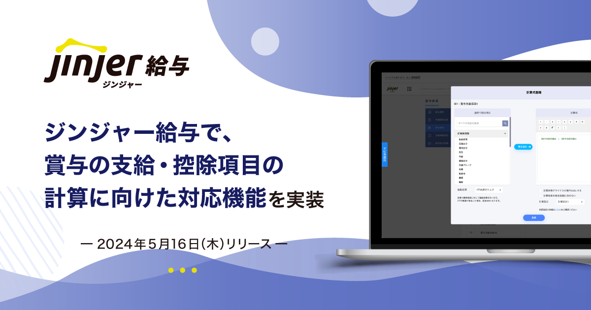 クラウド型人事労務システム「ジンジャー」を提供しているjinjer株式会社(本社:東京都新宿区、代表取締役社長:桑内 孝志)は、賞与の支給・控除項目の計算式に対応できる機能を5月16日(木)に実装したことをお知らせします。
