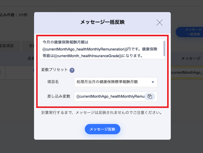 メッセージを一括反映するため設定画面にて、報酬月額に関連する差し込み変数(※)を予め設定することで、月変算定時の社会保険の報酬月額/等級の情報を自動転記できます。