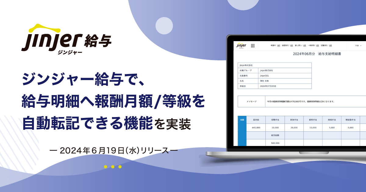 • クラウド型人事労務システム「ジンジャー」を提供しているjinjer株式会社(本社:東京都新宿区、代表取締役社長:桑内 孝志)は、「ジンジャー給与」へ、給与明細のメッセージ欄にて社会保険の報酬月額/等級の情報を自動転記できる機能を6月19日(水)に実装したことをお知らせします。