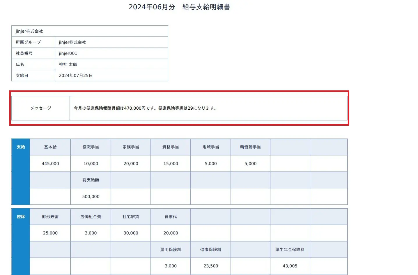 本機能実装で、「ジンジャー給与」の月変算定ができる機能にて、定時決定や随時改定がなされた後、従業員へその変更内容を通知する際に、給与明細のメッセージ欄にて、社会保険の報酬月額/等級の情報を自動転記できます。これにより、従業員ごとの報酬月額、等級を明細書にて通知することができるようになります。