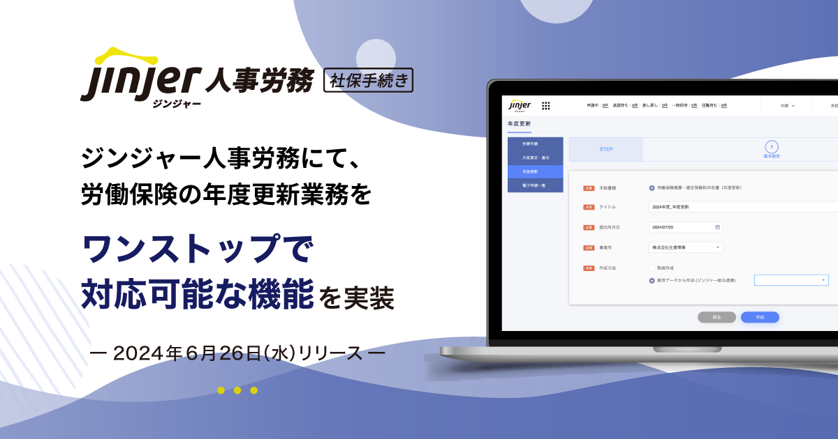 • クラウド型人事労務システム「ジンジャー」を提供しているjinjer株式会社(本社:東京都新宿区、代表取締役社長:桑内 孝志)は、「ジンジャー人事労務 社保手続きオプション」にて、労働保険の年度更新における帳票作成・申告・納付に関する一連業務に対応する機能を6月26日(水)に実装したことをお知らせします。