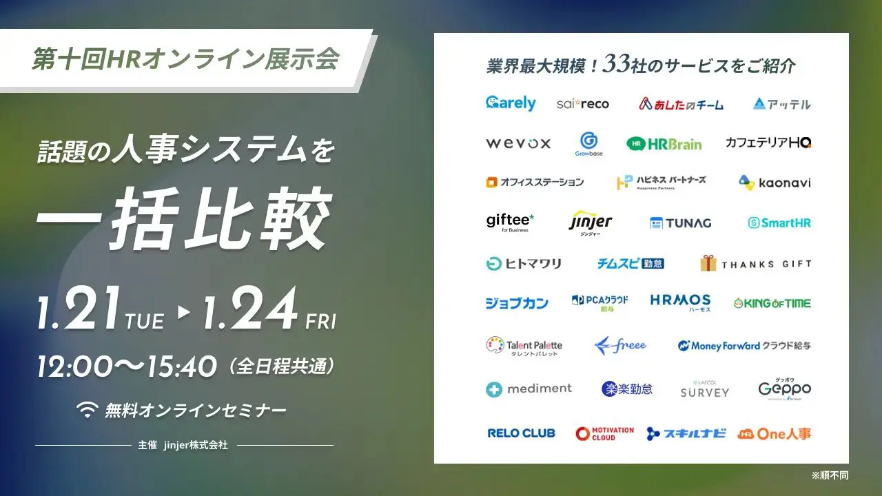 クラウド型人事労務システム「ジンジャー」を提供しているjinjer株式会社(本社:東京都新宿区、代表取締役社長:桑内 孝志 )は「第十回 HRオンライン展示会」を2025年1月21日(火)~24日(金)に開催することをお知らせします。