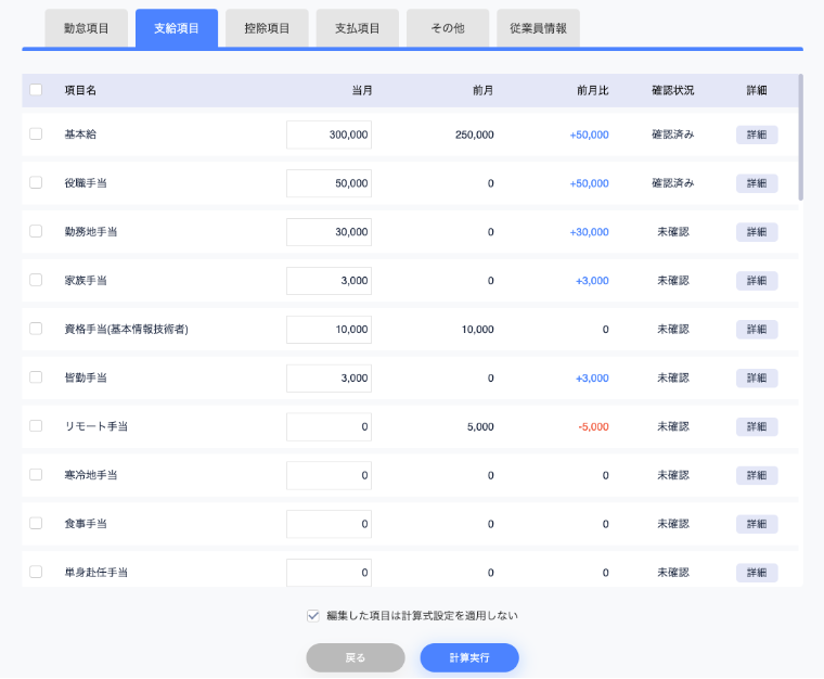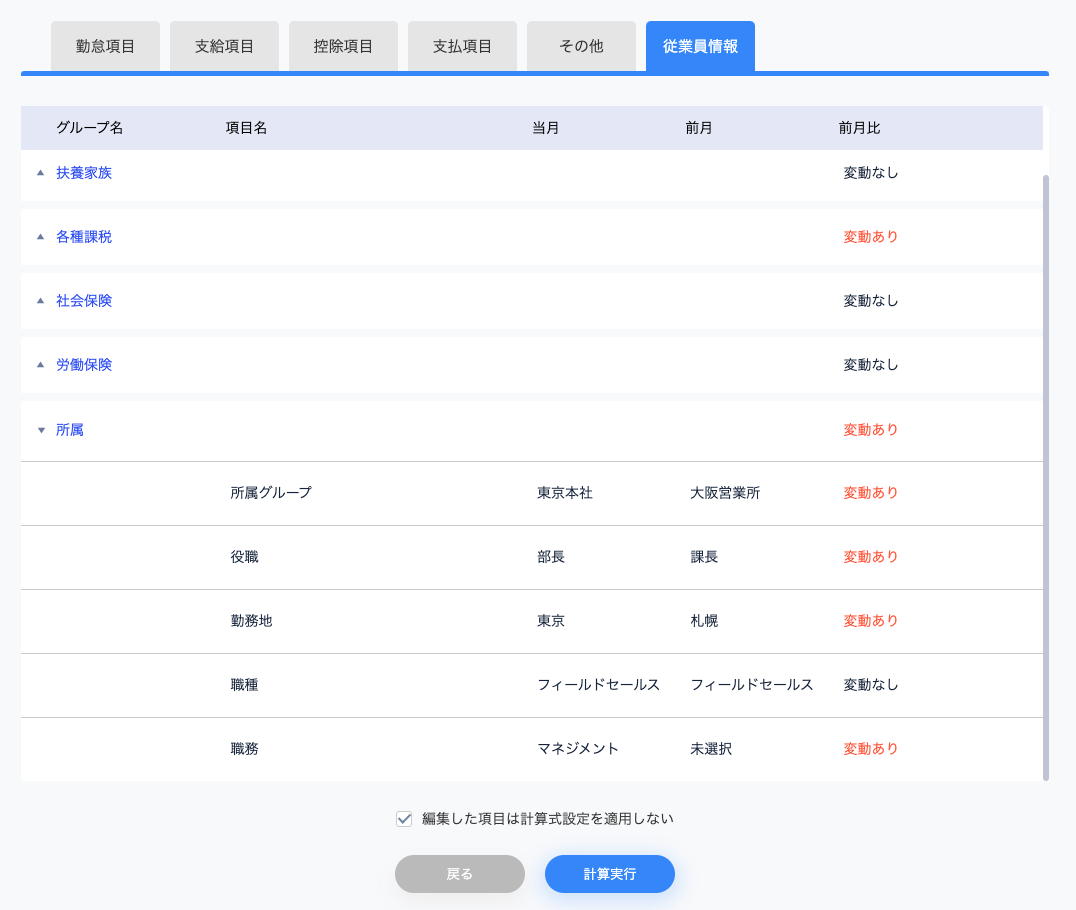 扶養家族/所得税/社会保険料等、給与計算時の設定に必要な情報や、所属/役職等の従業員情報に関して、前月との差分を画面上から確認することができます。