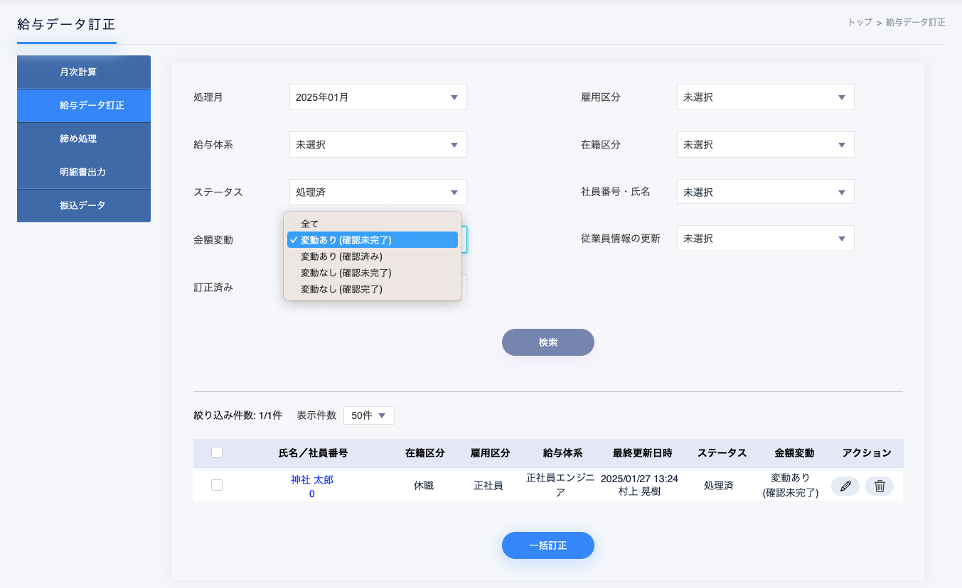 ・「前月給与と金額変動があるか否か」、「項目ごとの確認が完了しているか否か」というように、検索を行うことができます。また、前月と比較して従業員情報に変更がある従業員のみを絞り込んだり、給与担当者がデータ修正を行った従業員のみを絞り込むことも可能です。