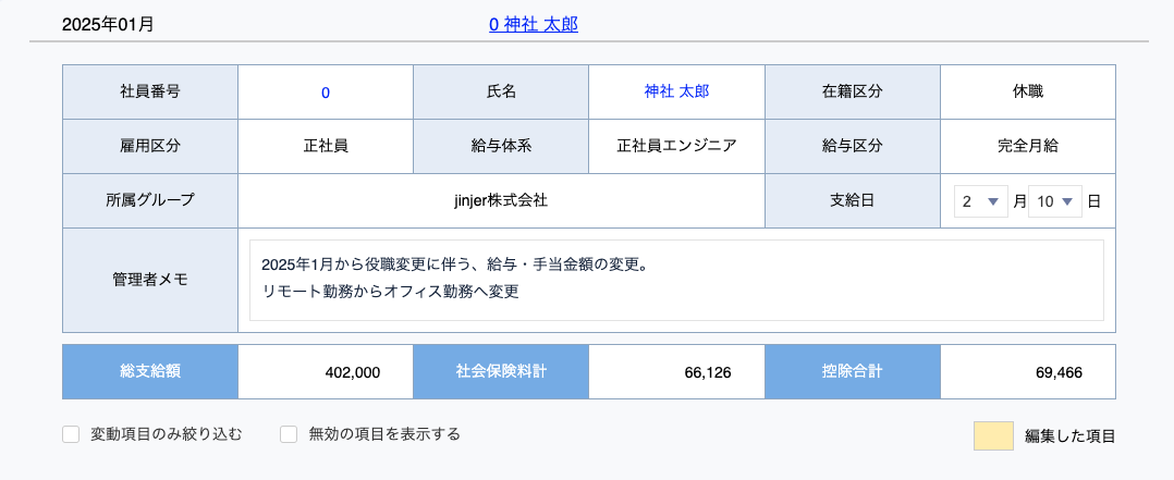 過去の給与データを確認する際に、部署内への伝達事項として、従業員ごとにメモを残すことができます。