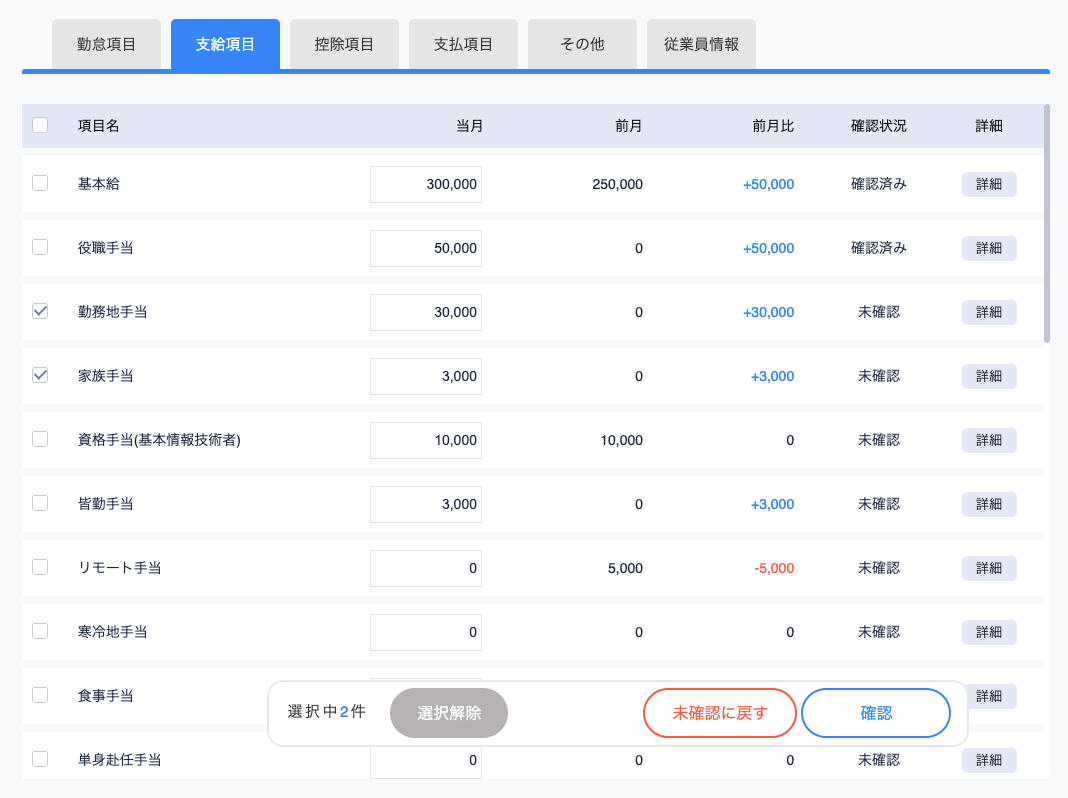 給与担当者は支給項目/控除項目ごとにチェックを行うことができ、その確認ステータスを更新することができます。また、一覧画面にて確認が完了した従業員、未確認の従業員を抽出することができます。