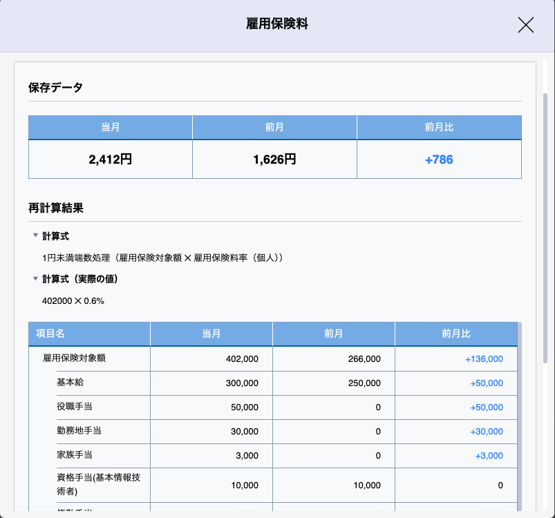 支給項目や控除項目で設定した計算式に使用されている従業員情報や給与単価等の内訳、また内訳ごとの前月差分を確認することができます。また以下画像のように所得税の源泉対象額や雇用保険の保険料対象額の内訳も確認することができます。これにより、どの項目が原因で前月との計算結果に差分が発生しているのか一目で確認することができます。