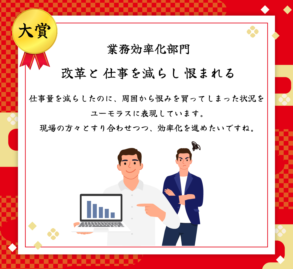 2024年の業務を振り返り、人事担当者として印象的だったこと・感じたことを川柳で表現してもらうという企画です。総応募数443件の中から、「業務効率化部門」「採用・育成部門」「人事の嘆き部門」の3部門に分け、各部門ごとに大賞、優秀賞の2つを選出しました。