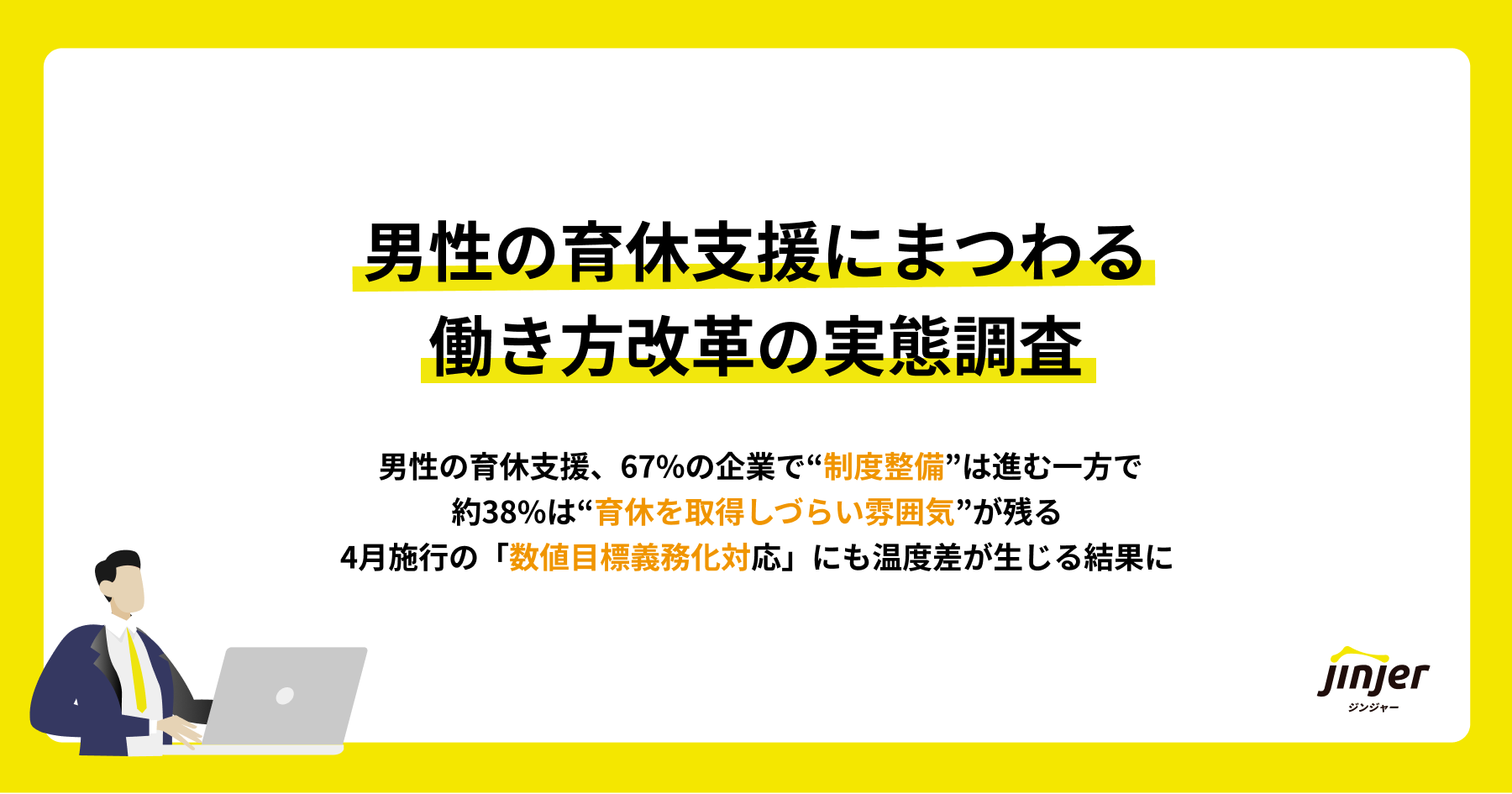 クラウド型人事労務システム「ジンジャー」を提供しているjinjer株式会社(本社:東京都新宿区 代表取締役社長CEO:冨永 健 以下、jinjer)は、企業の人事・総務担当者の計361名を対象に「男性の育休支援にまつわる働き方改革の実態」に関する調査を実施しました。