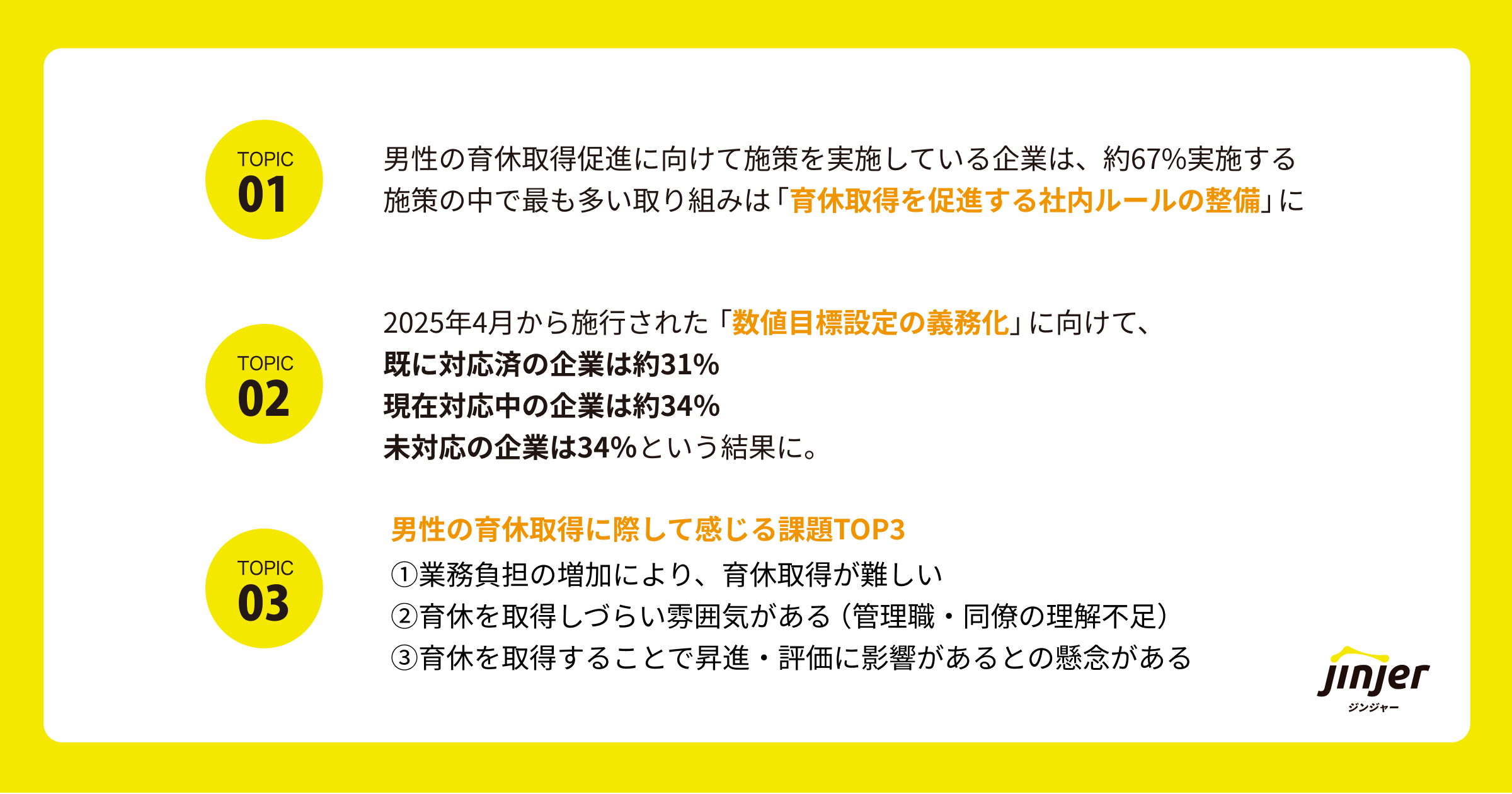 こうした背景を踏まえ、本調査では企業における男性育休支援の実態や、育休取得に関する課題・取り組み内容を明らかにし、今後のより実効性ある育休支援のあり方を探ることを目的としています。