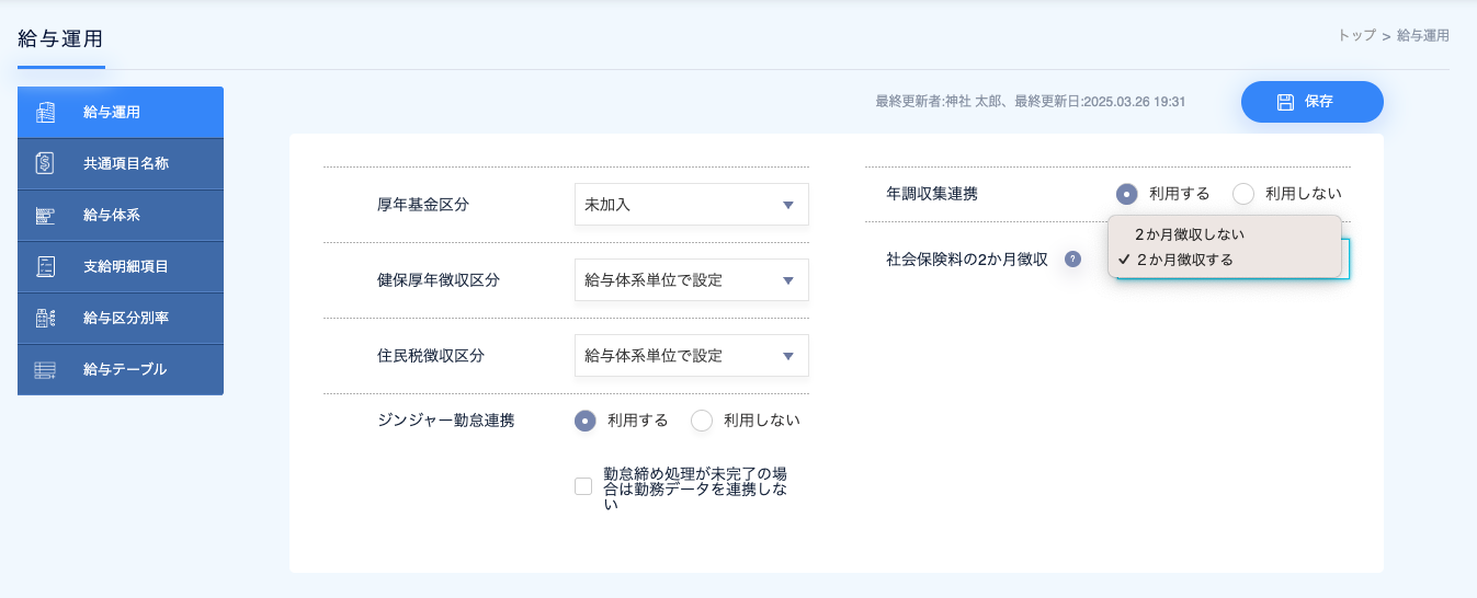 ※「ジンジャー給与」で、社会保険料の2か月分徴収を設定するイメージ