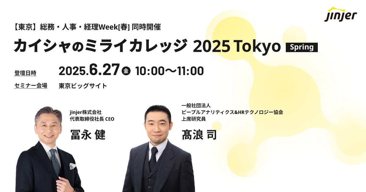 jinjer、代表取締役社長CEOの冨永健が 「カイシャのミライ カレッジ 2025 Tokyo Spring」に登壇 “正しい”人事データの活用をテーマに、 一般社団法人ピープルアナリティクス&HRテクノロジー協会の髙浪司氏と対談