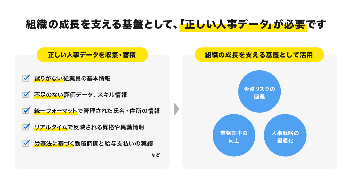 人事データは、労務管理や人事制度の運用など、人事の業務に欠かせない基盤となる情報です。