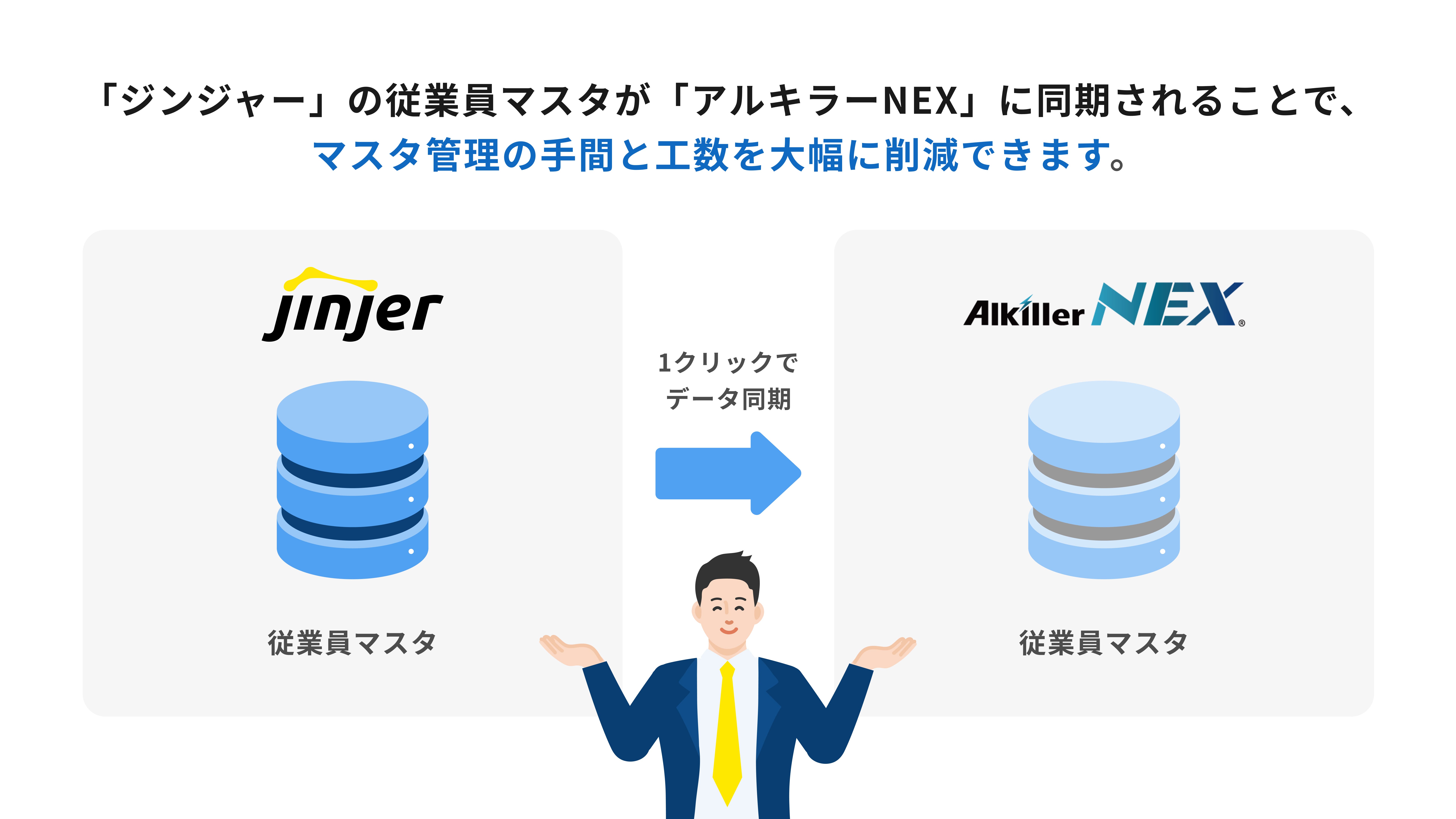 本連携により、従業員マスタの自動同期に対応することが可能になります。「ジンジャー」は、勤怠管理に加え、人事労務からワークフローまで、従業員の入社・退社、部署異動といった最新情報を一元管理できるプラットフォームです。今回の連携で、「ジンジャー」の従業員マスタが「アルキラーNEX」へ自動で同期され、人事担当者はマスタ管理の手間と工数を大幅に削減できます。これにより、ヒューマンエラーのリスクを排除し、常に正確かつ最新の従業員情報に基づいたシステム運用を推進します。また、人事部門の業務効率化に大きく貢献し、人事部門が対応すべきコア業務への集中を可能にします。