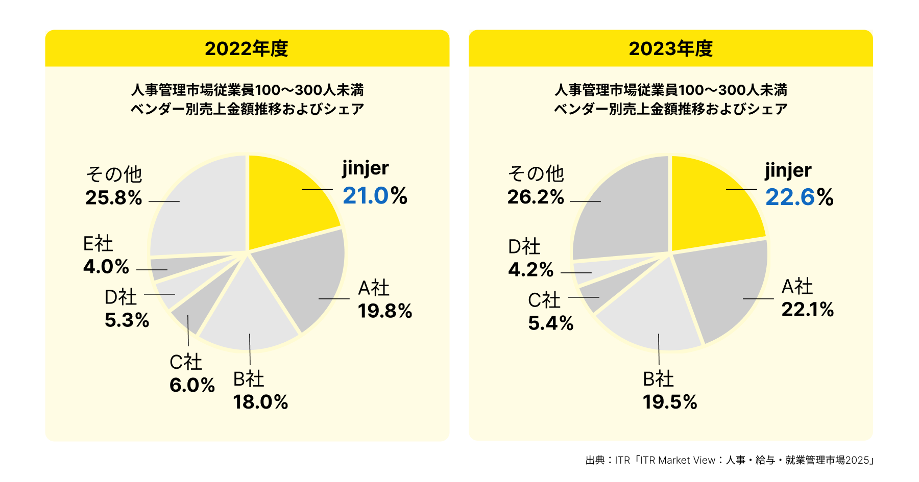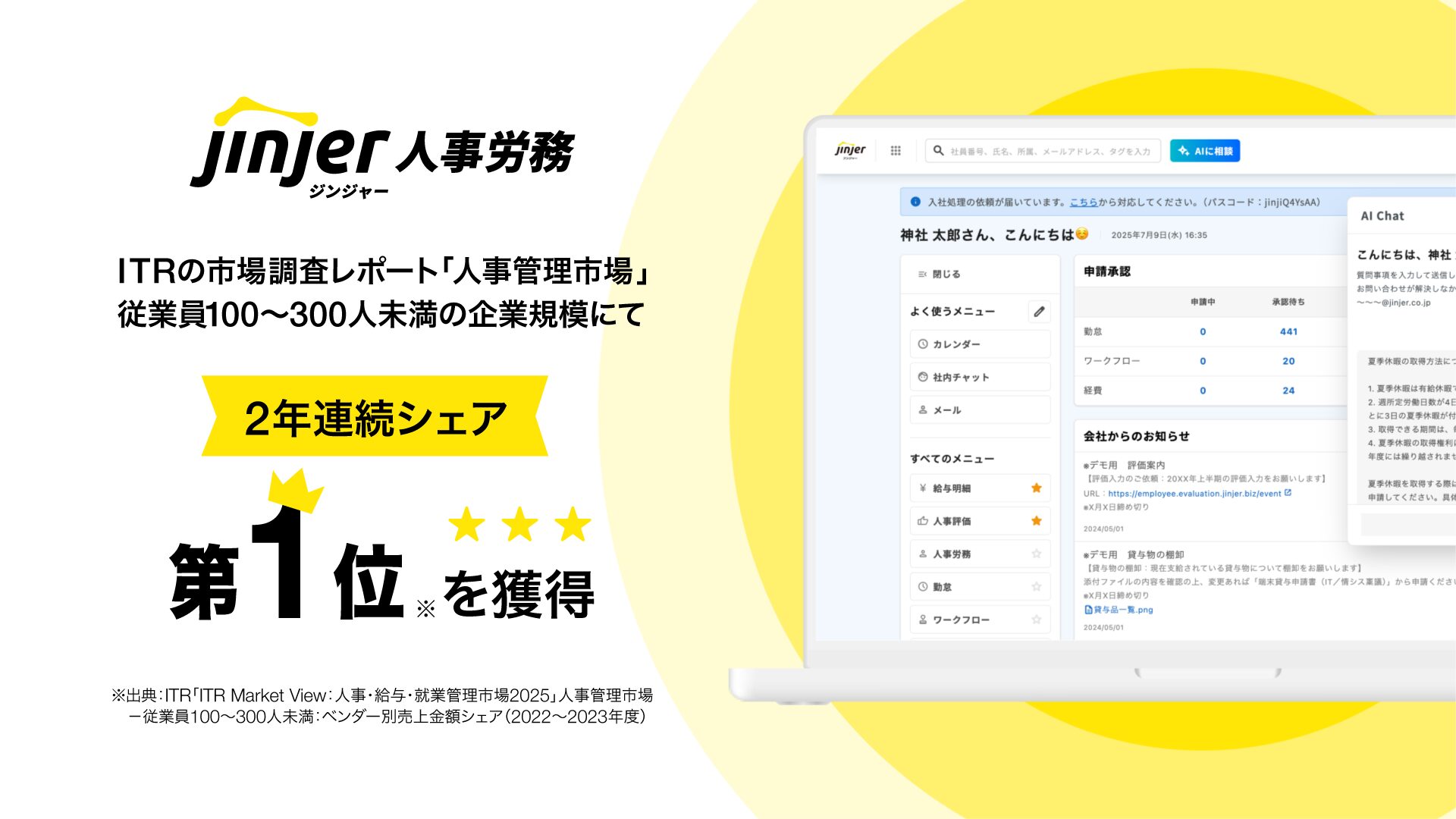• jinjer株式会社(本社:東京都新宿区、代表取締役社長CEO:冨永 健)が提供するクラウド型人事労務システム「ジンジャー」が、株式会社アイ・ティ・アール(以下、ITR)が発行する市場調査レポート「ITR Market View:人事・給与・就業管理市場2025」において、人事管理市場における従業員100~300人未満の企業規模にて、2022年度および2023年度のベンダー別売上金額シェアで2年連続No.1を獲得したことをお知らせします。