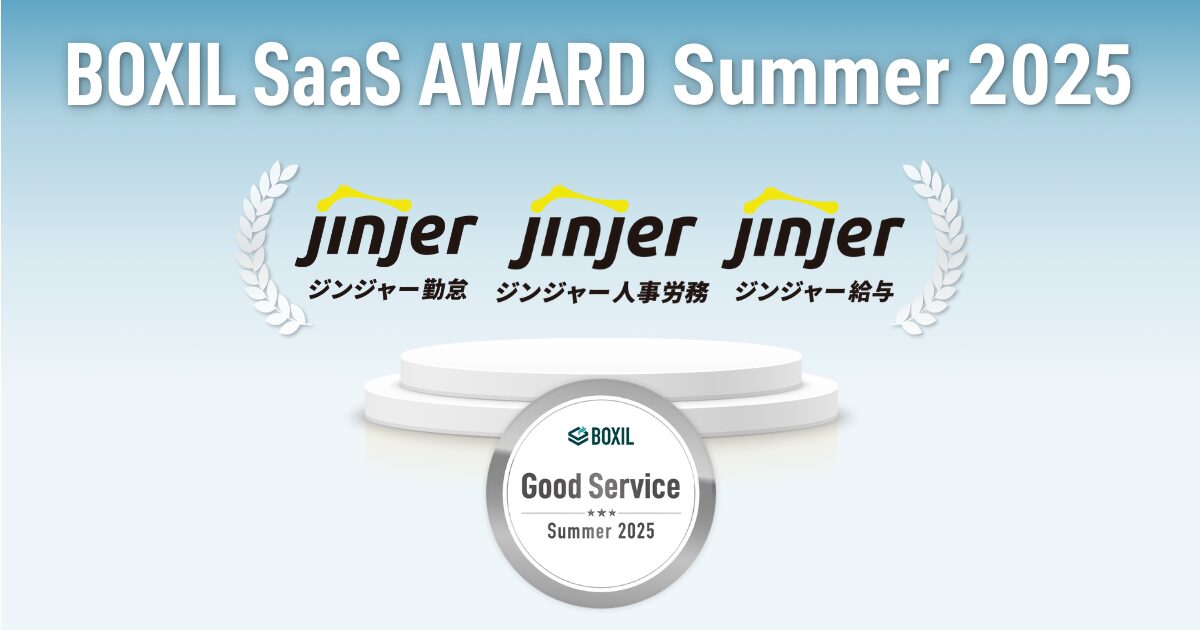 クラウド型人事労務システム「ジンジャー」を提供しているjinjer株式会社(本社:東京都新宿区 代表取締役社長CEO:冨永 健)は、スマートキャンプ株式会社(以下「スマートキャンプ」)が主催する「BOXIL SaaS AWARD Summer 2025」にて、「ジンジャー勤怠」「ジンジャー人事労務」「ジンジャー給与」の3サービス各部門で「Good Service」を受賞したことをお知らせします。