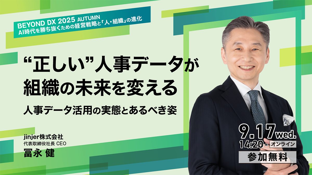 「BEYOND DX」では、これまでにDXを浸透させるための「人・組織」について議論を深めてきました。今回は、生成AIの進化がもたらすビジネス環境の変化を踏まえ、企業がいかにデジタル戦略を再構築し、組織・人材の体制を整えていくべきかについて、DXキーパーソンと共に探っていきます。jinjerからは代表取締役社長 CEOの冨永が登壇します。