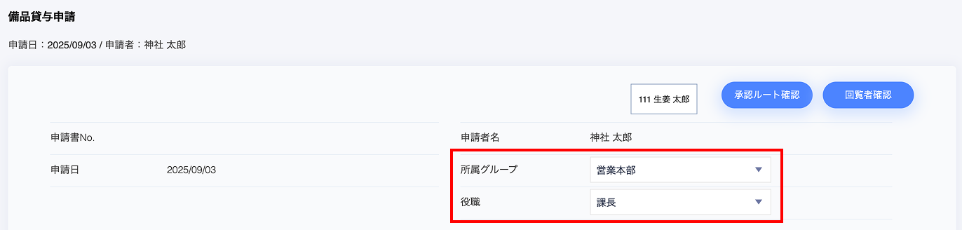 申請時に、本来の所属部署か、兼務先の部署・役職をプルダウンから選択できます。これにより、申請者は自身のどの立場で申請を行うかを明確にできます。