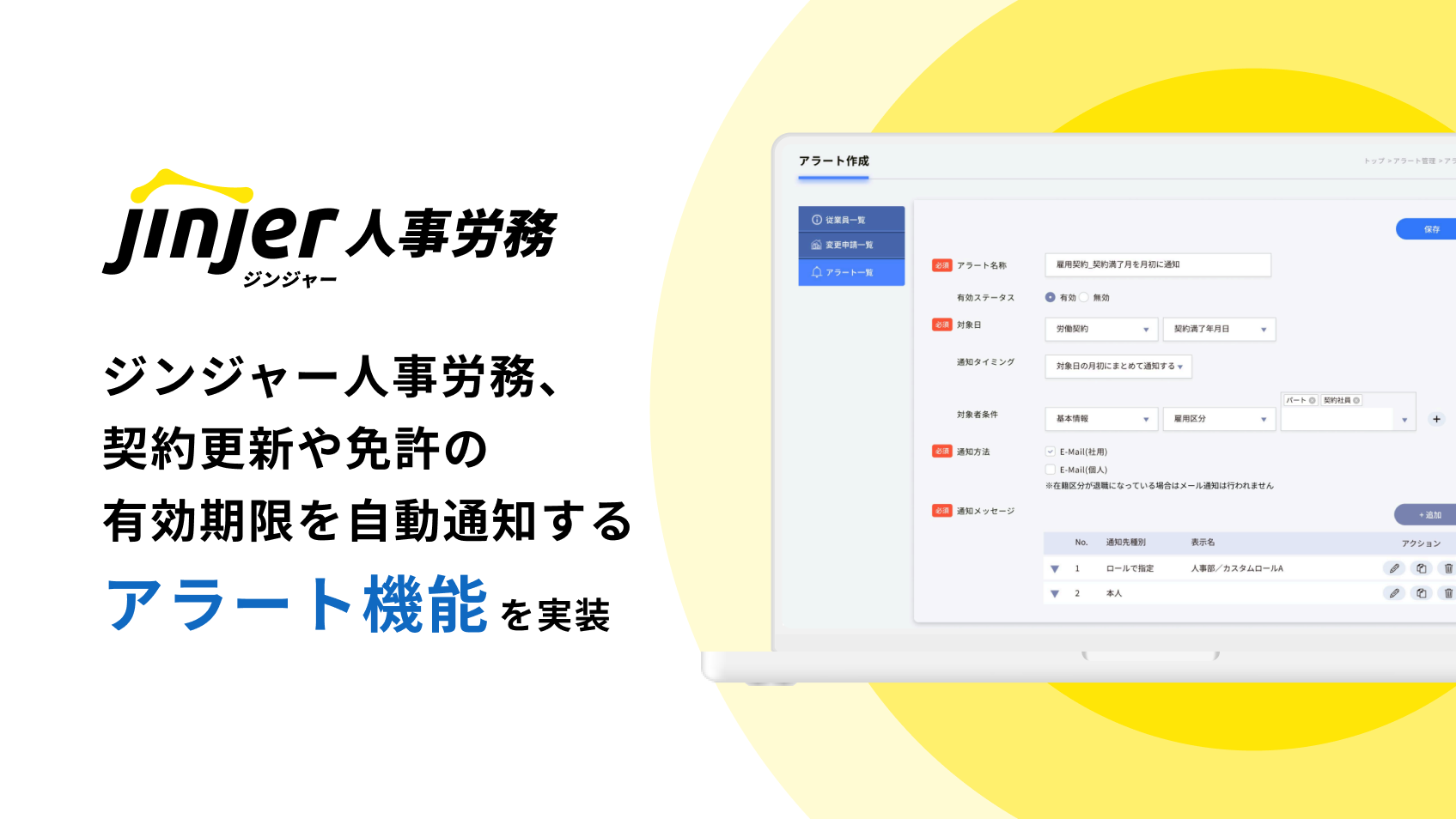 jinjer株式会社(本社:東京都新宿区、代表取締役社長CEO:冨永 健)が提供するクラウド型人事労務システム「ジンジャー人事労務」は、従業員情報に紐づく様々な期日を自動で通知する「アラート機能」を実装したことをお知らせします。 本機能により、有期雇用契約の更新や免許の有効期限切れなどの管理業務を自動化し、人事労務担当者の業務負担を軽減するとともに、更新漏れのリスクを防止します。