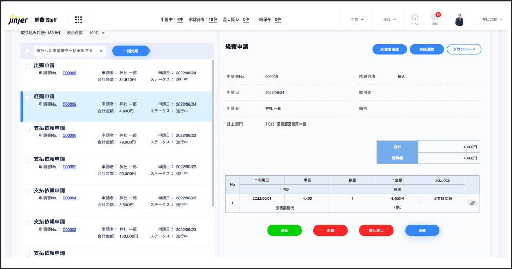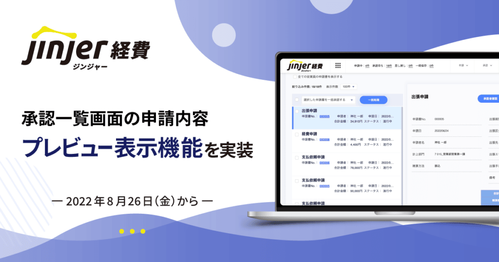 jinjer株式会社(本社:東京都新宿区、代表取締役CEO:加藤 賢、以下jinjer)が提供する、バックオフィス向けクラウドサービス「ジンジャー経費」に、承認者の承認一覧画面で申請内容をプレビュー表示できる機能を2022年8月26日(金)から実装することをお知らせいたします。