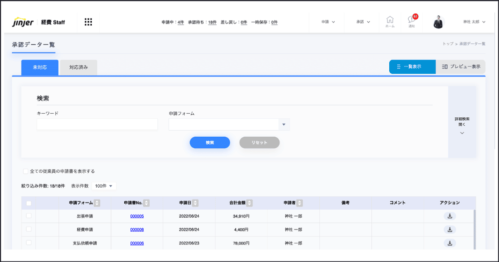 画面の左に申請書の一覧を表示して、画面右側に選択した申請書の詳細情報が表示されます。