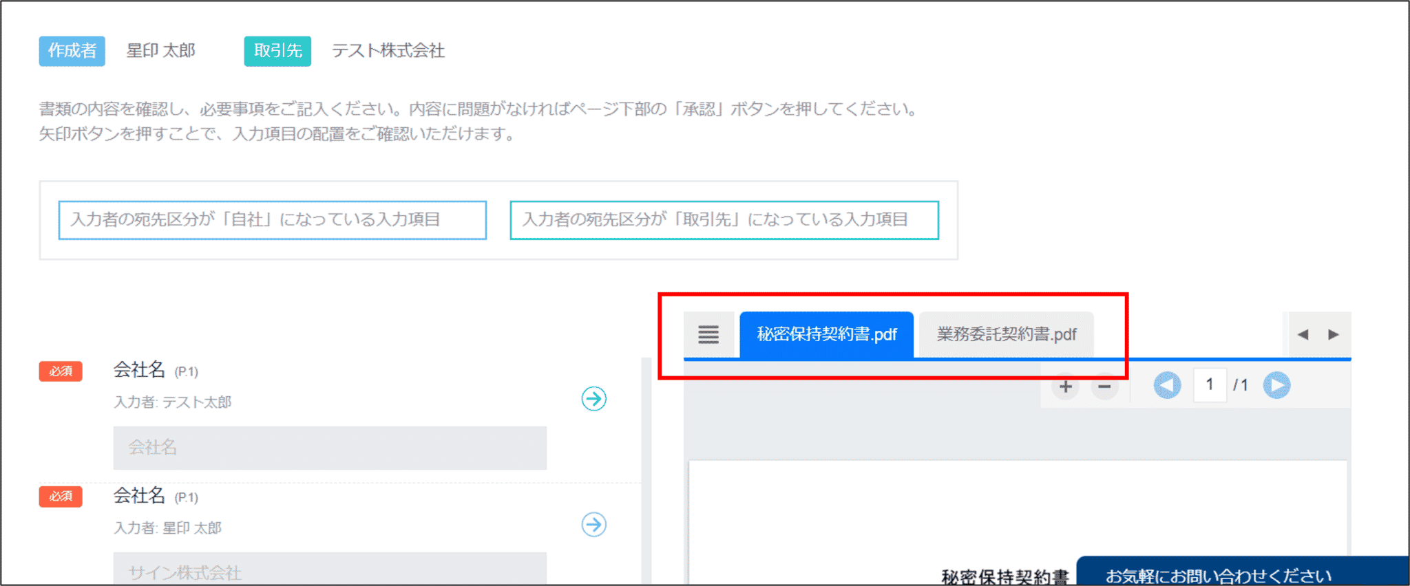 社内ワークフローの承認画面では、以下のようにファイル名タブのクリックで、表示ファイルの切り替えを行うことが可能です。